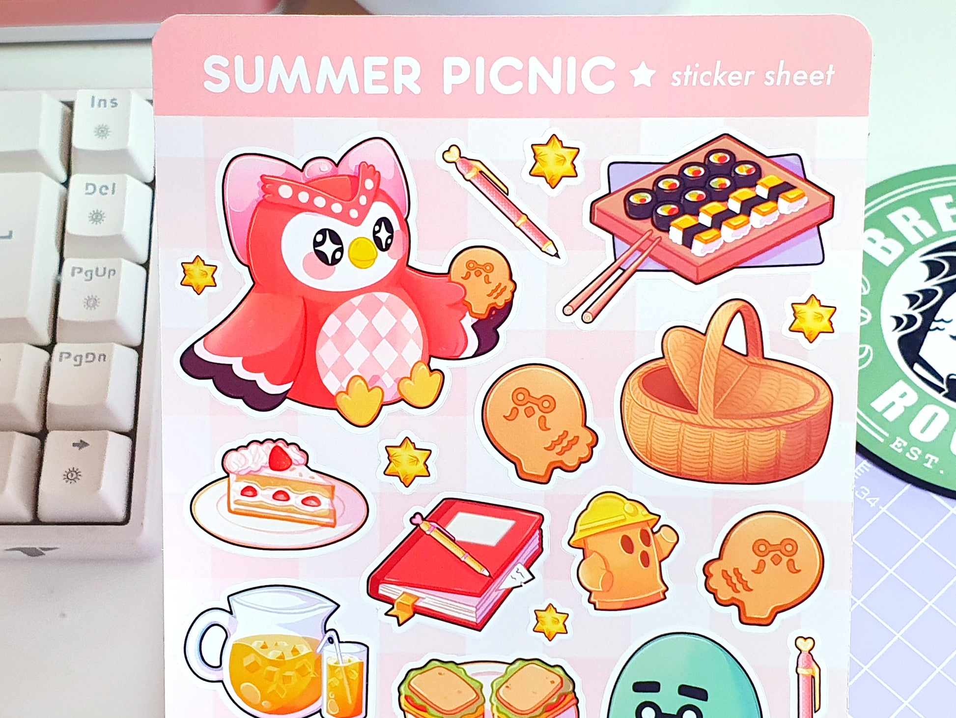 🍣🍰 Stickers full of summer snacks! This Animal Crossing inspired sheet stars Brewster and Celeste, with sushi, cake, and chilled drinks. The perfect picnic spread! 🌿✨